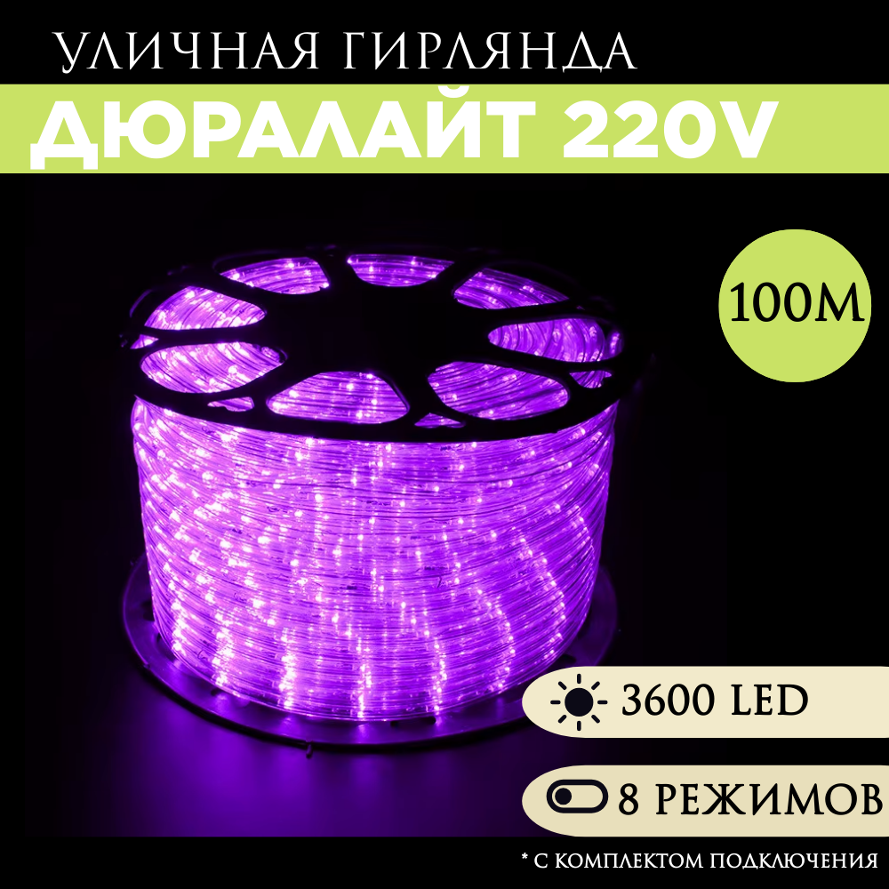 Дюралайт 100м 8 режимов свечения фиолетовый 13мм 3-х жильн. 36LED/м 2.17Вт/м с комплектом подключения