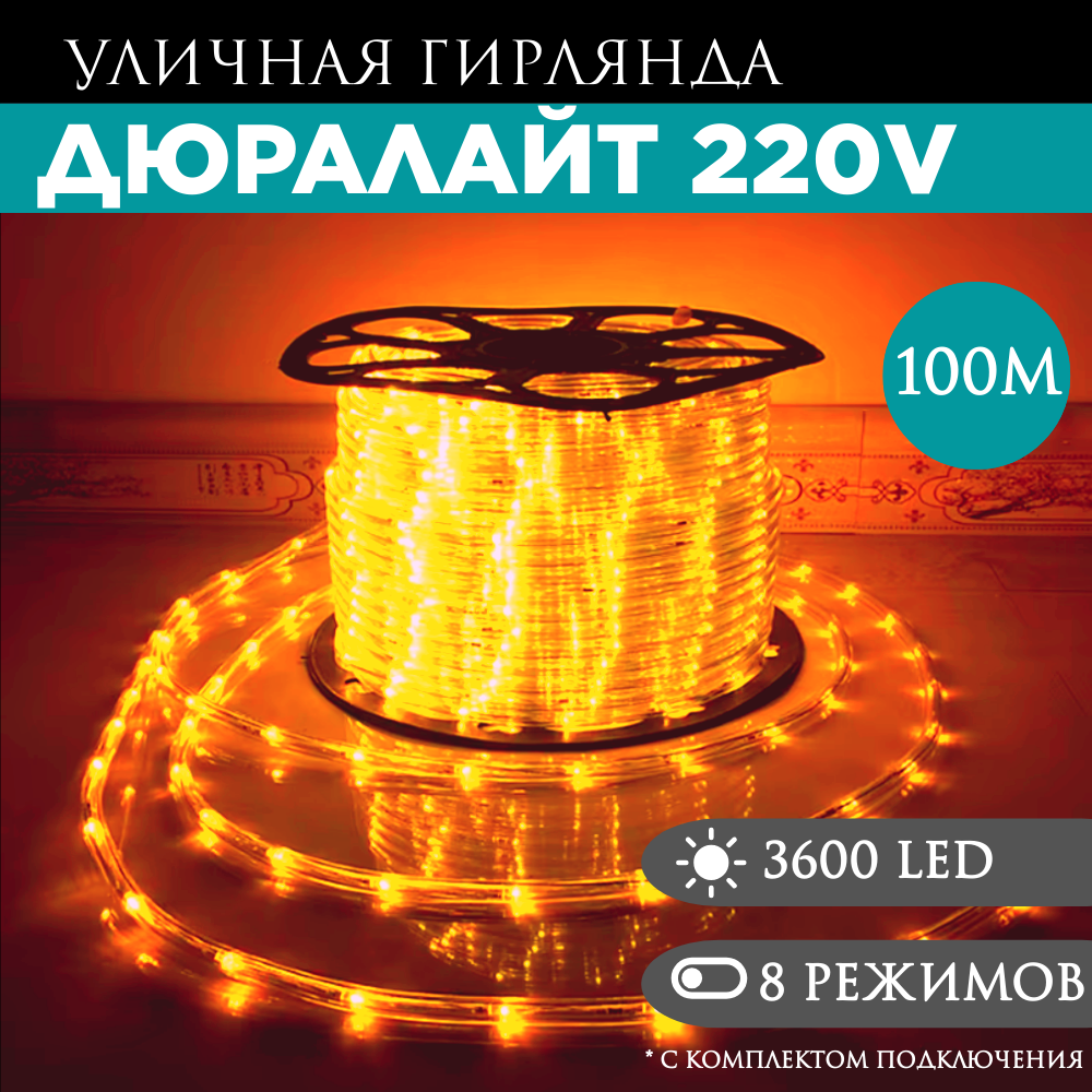 Дюралайт 100м 8 режимов свечения оранжевый 13мм 3-х жильн. 36LED/м 2.17Вт/м с комплектом подключения