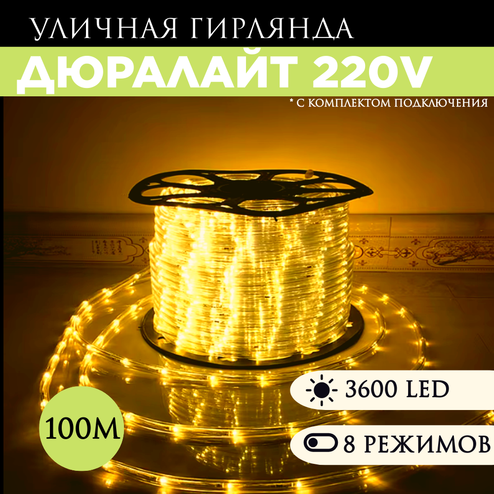 Дюралайт 100м 8 режимов свечения желтый 13мм 3-х жильн. 36LED/м 2.17Вт/м с комплектом подключения