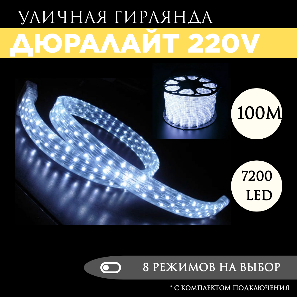 Дюралайт квадратный плоский 100м 8 режимов свечения белый 11X17.5мм 3-х жильн. 72LED/м 4.32Вт/м с комплектом подключения