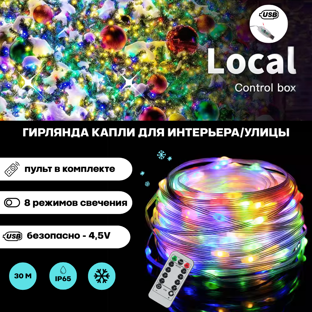 Гирлянда уличная новогодняя светодиодная Роса с пультом, RGB, мульти, разноцветный свет, 8 режимов, 300 LED, 30м, IP65, USB
