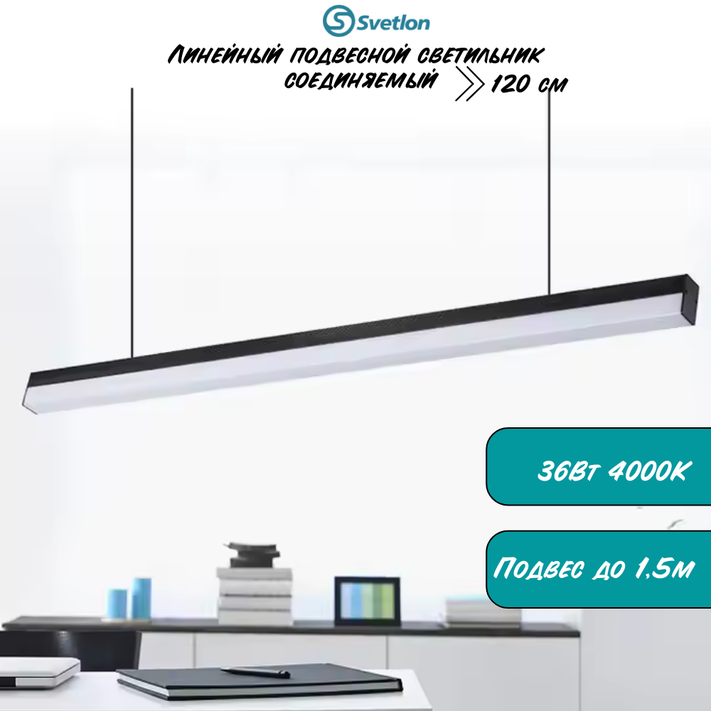 Модель светильника делает его очень элегантным, он выглядят очень стильно и современно, обеспечивая высокую светоотдачу. В комплект со светильником входят подвесы длиной 1.5м и комплект соединителей (2шт.).