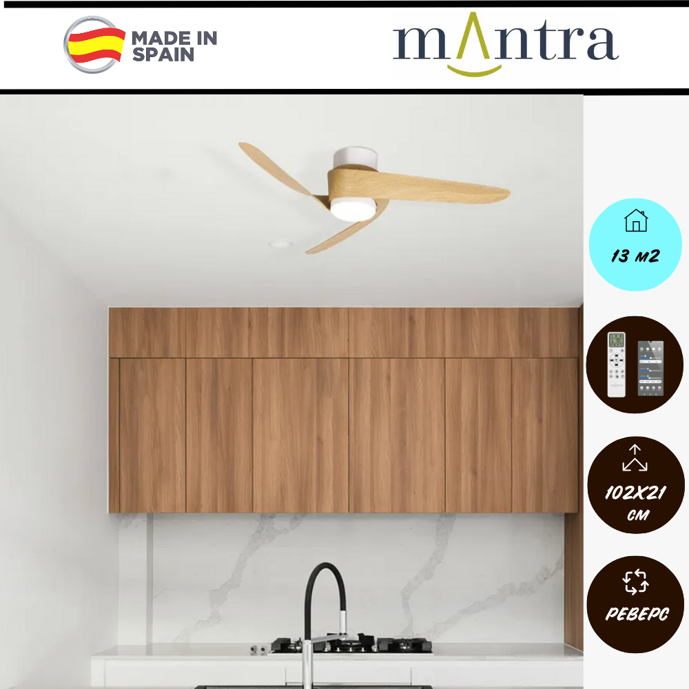 Создайте комфортный микроклимат в вашем доме с помощью стильной испанской люстры-вентилятора потолочной от Mantra! Эта элегантная модель для освещения и вентиляции, в в стиле модерн, станет украшением вашей спальни, гостиной, закрытой веранды, подходит для больших помещений. Благодаря 8 скоростям вращения и функции реверса, вентилятор обеспечивает приятное охлаждение летом и циркуляцию воздуха зимой на площади до 13 м2. Оснащен двигателем DC-бесшумный. Лопасти необоротные, цвет - под дерево, материал лопастей - пластик, цвет арматуры - белый. Люстра светодиодным светильником на 24Вт с регулируемой цветовой температурой, создавая уютную атмосферу. Управление вентилятором и освещением осуществляется с помощью удобного пульта управления и приложения. Гарантия 5 лет. Дополнительные опции - диммирование, ночной режим, смена цветовой температуры, таймер. Создайте идеальный комфорт в вашем доме с помощью потолочного вентилятора со светильником!