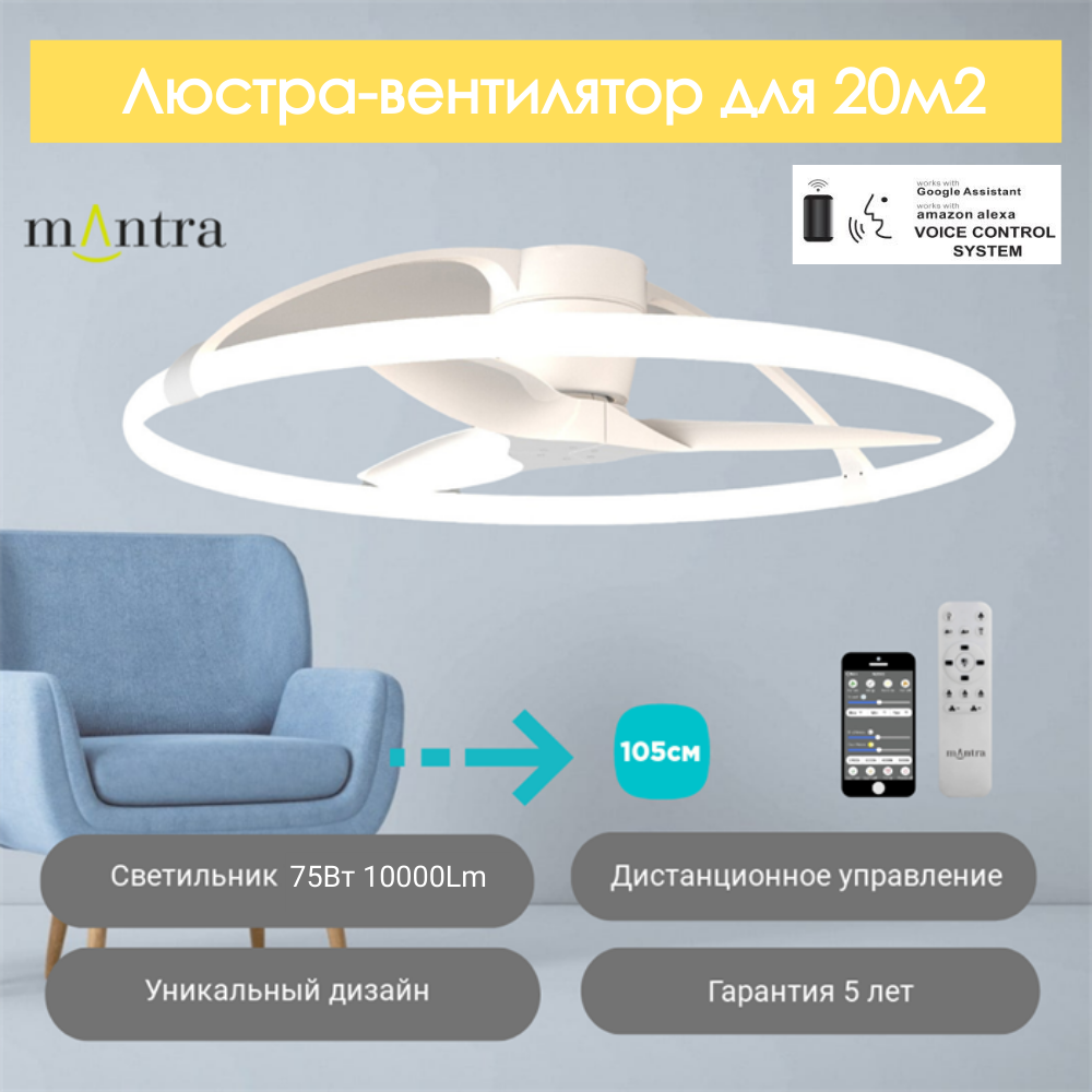 Создайте комфортный микроклимат в вашем доме с помощью стильной испанской люстры-вентилятора потолочной от Mantra! Эта элегантная модель для освещения и вентиляции, в в стиле модерн, станет украшением вашей гостиной, спальни или закрытой веранды. Благодаря 4 скоростям вращения и функции реверса, вентилятор обеспечивает приятное охлаждение летом и циркуляцию воздуха зимой на площади до 20 м2. Оснащен двигателем DC-бесшумный. Лопасти, цвет - белый, материал лопастей - пластик, цвет арматуры - белый. Люстра оснащена встроенным светодиодным светильником, мощностью 75 Вт, 2700-5000К, создавая уютную атмосферу. Управление вентилятором и освещением осуществляется с помощью удобного пульта управления, также при помощи скачанного приложения по Bluetooth. Данная модель имеет дополнительные функции — возможность голосового управления, смена цветовой температуры, диммирование, таймер, ночной режим. Гарантия 5 лет. .создайте идеальный комфорт в вашем доме с помощью потолочного вентилятора со светильником!