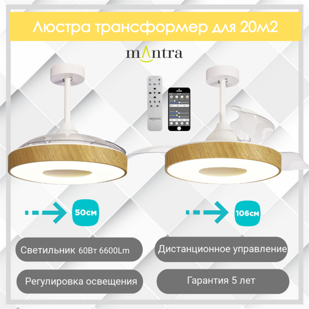 Создайте комфортный микроклимат в вашем доме с помощью стильной испанской люстры-вентилятора потолочной от Mantra! Эта элегантная модель для освещения и вентиляции, в в современном стиле, станет украшением вашей гостиной, кухни, спальни или закрытой веранды. Благодаря 6 скоростям вращения и функции реверса, вентилятор обеспечивает приятное охлаждение летом и циркуляцию воздуха зимой на площади до 20 м2. Оснащен двигателем DC-бесшумный. Лопасти, цвет - прозрачный, материал лопастей - пластик, цвет арматуры - белый;дерево. Люстра оснащена встроенным светодиодным светильником, мощностью 60 Вт, 2700-5000К, создавая уютную атмосферу. Управление вентилятором и освещением осуществляется с помощью удобного пульта управления и приложения. Данная модель имеет выдвижные лопасти, которые активируются при включении режима вентиляции, а также есть дополнительные функции — диммирование, смена цветовой температуры, таймер, ночной режим и возможность регулировки высоты 35,5-48см. Гарантия 5 лет. .создайте идеальный комфорт в вашем доме с помощью потолочного вентилятора со светильником!