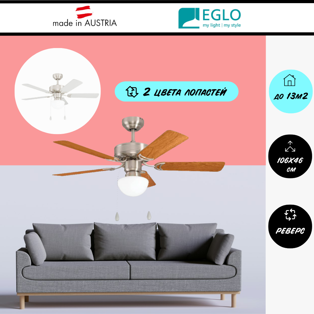Создайте комфортный микроклимат в вашем доме с помощью стильной австрийской люстры-вентилятора потолочной от Eglo! Эта элегантная модель для освещения и вентиляции, в классическом стиле, станет украшением вашей гостиной, кухни, спальни или закрытой веранды. Благодаря 3 скоростям вращения и функции реверса, вентилятор обеспечивает приятное охлаждение летом и циркуляцию воздуха зимой на площади до 13 м2. Оснащен двигателем AC-стандарт. Оборотные лопасти позволят вам менять внешний вид вентилятора по своему настроению, цвет - дуб;серый, материал лопастей - МДФ, цвет арматуры - матовый никель. Люстра оснащена 1 лампами с цоколем Е27, создавая уютную атмосферу. Управление вентилятором и освещением осуществляется с помощью удобных тяговых цепей управления. . Гарантия 2 года. .создайте идеальный комфорт в вашем доме с помощью потолочного вентилятора со светильником!