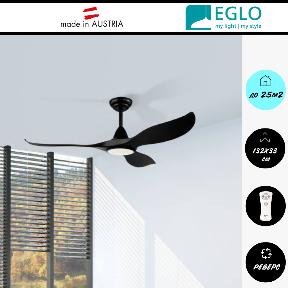 Создайте комфортный микроклимат в вашем доме с помощью стильной австрийской люстры-вентилятора потолочной от Eglo! Эта элегантная модель для освещения и вентиляции, в в стиле модерн, лофт, станет украшением вашей гостиной, спальни или закрытой веранды. Благодаря 5 скоростям вращения и функции реверса, вентилятор обеспечивает приятное охлаждение летом и циркуляцию воздуха зимой на площади до 17-25 м2. Оснащен двигателем DC-бесшумный. Лопасти, цвет - черный, материал лопастей - ABS пластик, цвет арматуры - черный. Люстра оснащена встроенным светодиодным светильником, мощностью 15 Вт, 3000-5000К, создавая уютную атмосферу. Управление вентилятором и освещением осуществляется с помощью удобного пульта управления. Данная модель имеет дополнительные функции — смена цветовой температуры, таймер. Гарантия 2 года. .создайте идеальный комфорт в вашем доме с помощью потолочного вентилятора со светильником!