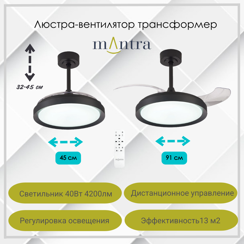 Создайте комфортный микроклимат в вашем доме с помощью стильной испанской люстры-вентилятора потолочной от Mantra! Эта элегантная модель для освещения и вентиляции, в в стиле модерн, станет украшением вашей спальни, гостиной, закрытой веранды, подходит для больших помещений. Благодаря 6 скоростям вращения вентилятор обеспечивает приятное охлаждение летом на площади до 13 м2. Оснащен двигателем DC-бесшумный. Лопасти, цвет - прозрачный, материал лопастей - пластик, цвет арматуры - черный. Люстра светодиодным светильником на 40Вт с регулируемой цветовой температурой, создавая уютную атмосферу. Управление вентилятором и освещением осуществляется с помощью удобного пульта управления. Гарантия 5 лет. Дополнительные опции - диммирование, ночной режим, смена цветовой температуры, таймер и выдвижные лопасти. Создайте идеальный комфорт в вашем доме с помощью потолочного вентилятора со светильником!