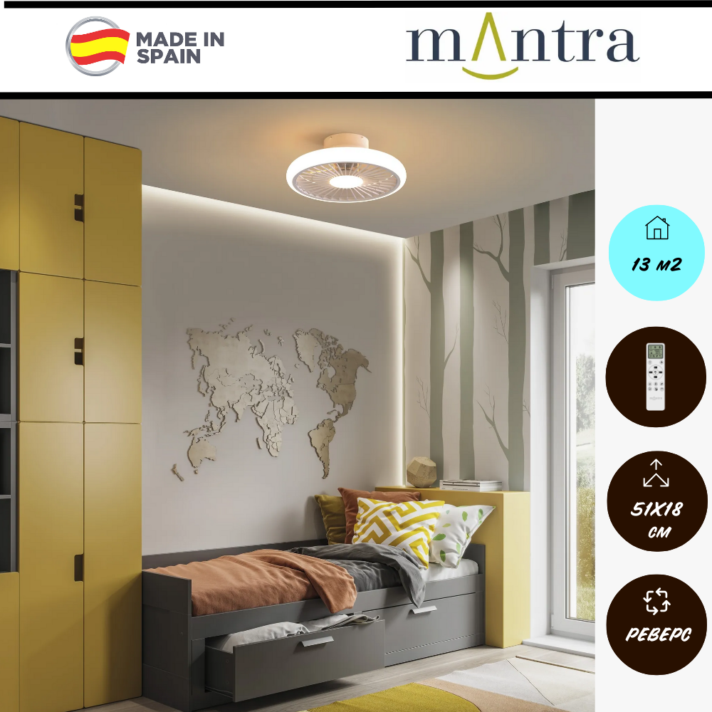Создайте комфортный микроклимат в вашем доме с помощью стильной испанской люстры-вентилятора потолочной от Mantra! Эта элегантная модель для освещения и вентиляции, в в современном стиле, станет украшением вашей спальни, кухни или закрытой веранды. Благодаря 3 скоростям вращения и функции реверса, вентилятор обеспечивает приятное охлаждение летом и циркуляцию воздуха зимой на площади до 13 м2. Оснащен двигателем DC-бесшумный. Лопасти, цвет - прозрачный, материал лопастей - пластик, цвет арматуры - белый. Люстра оснащена встроенным светодиодным светильником, мощностью 60 Вт, 2700-5000К, создавая уютную атмосферу. Управление вентилятором и освещением осуществляется с помощью удобного пульта управления. Данная модель имеет дополнительные функции — смена цветовой температуры, диммирование, таймер, ночной режим. Гарантия 5 лет. .создайте идеальный комфорт в вашем доме с помощью потолочного вентилятора со светильником!