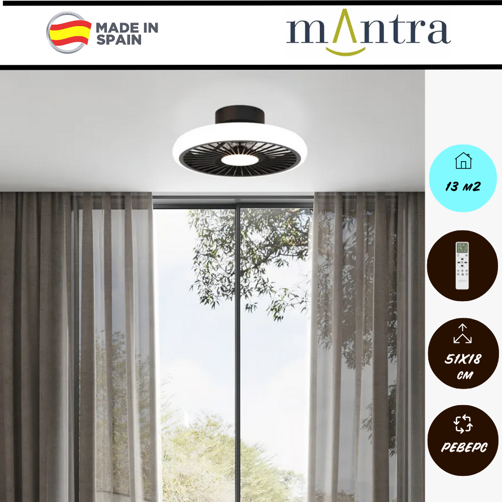 Создайте комфортный микроклимат в вашем доме с помощью стильной испанской люстры-вентилятора потолочной от Mantra! Эта элегантная модель для освещения и вентиляции, в в современном стиле, станет украшением вашей спальни, кухни или закрытой веранды. Благодаря 3 скоростям вращения и функции реверса, вентилятор обеспечивает приятное охлаждение летом и циркуляцию воздуха зимой на площади до 13 м2. Оснащен двигателем DC-бесшумный. Лопасти, цвет - прозрачный, материал лопастей - пластик, цвет арматуры - черный. Люстра оснащена встроенным светодиодным светильником, мощностью 60 Вт, 2700-5000К, создавая уютную атмосферу. Управление вентилятором и освещением осуществляется с помощью удобного пульта управления. Данная модель имеет дополнительные функции — смена цветовой температуры, диммирование, таймер, ночной режим. Гарантия 5 лет. .создайте идеальный комфорт в вашем доме с помощью потолочного вентилятора со светильником!