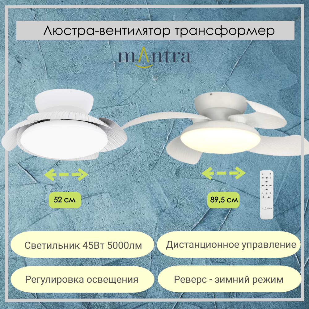 Создайте комфортный микроклимат в вашем доме с помощью стильной испанской люстры-вентилятора потолочной от Mantra! Эта элегантная модель для освещения и вентиляции, в в современном стиле, станет украшением вашей спальни, кухни или гостиной. Благодаря 3 скоростям вращения и функции реверса, вентилятор обеспечивает приятное охлаждение летом и циркуляцию воздуха зимой на площади до 13-20 м2. Оснащен двигателем DC-бесшумный. Лопасти, цвет - белый, материал лопастей - пластик, цвет арматуры - белый. Люстра оснащена встроенным светодиодным светильником, мощностью 45 Вт, 2700-5000К, создавая уютную атмосферу. Управление вентилятором и освещением осуществляется с помощью удобного пульта управления. Данная модель имеет выдвижные лопасти, которые активируются при включении режима вентиляции, а также есть дополнительные функции — диммирование, смена цветовой температуры, таймер . Гарантия 5 лет. .создайте идеальный комфорт в вашем доме с помощью потолочного вентилятора со светильником!