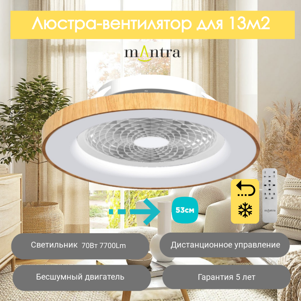 Создайте комфортный микроклимат в вашем доме с помощью стильной испанской люстры-вентилятора потолочной от Mantra! Эта элегантная модель для освещения и вентиляции, в в стиле модерн, станет украшением вашей спальни, кухни или закрытой веранды. Благодаря 3 скоростям вращения и функции реверса, вентилятор обеспечивает приятное охлаждение летом и циркуляцию воздуха зимой на площади до 13 м2. Оснащен двигателем DC-бесшумный. Лопасти, цвет - прозрачный, материал лопастей - пластик, цвет арматуры - белый;дерево. Люстра оснащена встроенным светодиодным светильником, мощностью 70 Вт, 2700-5000К, создавая уютную атмосферу. Управление вентилятором и освещением осуществляется с помощью удобного пульта управления. Данная модель имеет дополнительные функции — смена цветовой температуры, диммирование, таймер, ночной режим. Гарантия 5 лет. .создайте идеальный комфорт в вашем доме с помощью потолочного вентилятора со светильником!