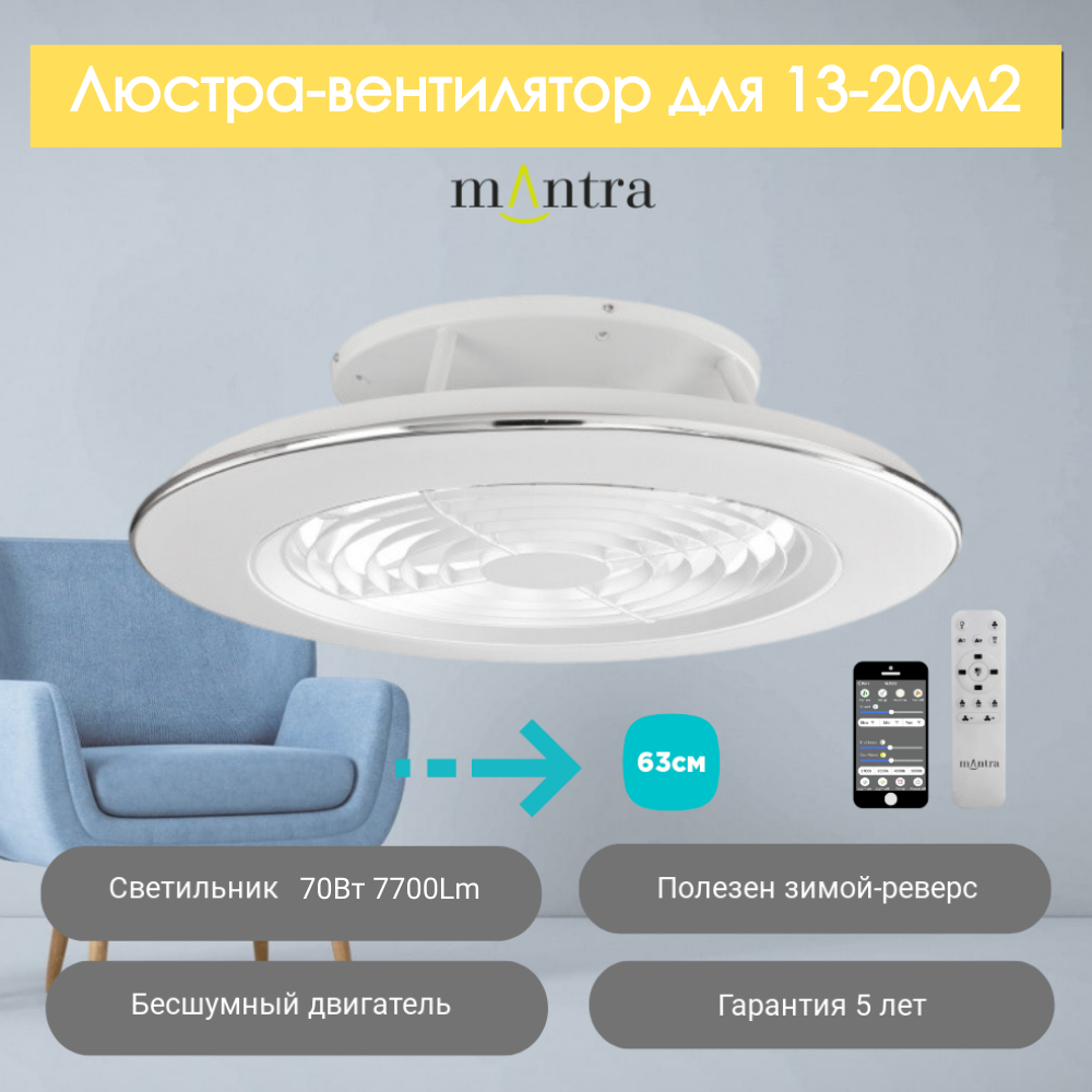 Создайте комфортный микроклимат в вашем доме с помощью стильной испанской люстры-вентилятора потолочной от Mantra! Эта элегантная модель для освещения и вентиляции, в в стиле модерн, станет украшением вашей гостиной, кухни, спальни или закрытой веранды. Благодаря 3 скоростям вращения и функции реверса, вентилятор обеспечивает приятное охлаждение летом и циркуляцию воздуха зимой на площади до 13-20 м2. Оснащен двигателем DC-бесшумный. Лопасти, цвет - прозрачный, материал лопастей - пластик, цвет арматуры - белый. Люстра оснащена встроенным светодиодным светильником, мощностью 70 Вт, 2700-5000К, создавая уютную атмосферу. Управление вентилятором и освещением осуществляется с помощью удобного пульта управления, также при помощи скачанного приложения по Bluetooth. Данная модель имеет дополнительные функции — смена цветовой температуры, диммирование, таймер, ночной режим. Гарантия 5 лет. .создайте идеальный комфорт в вашем доме с помощью потолочного вентилятора со светильником!