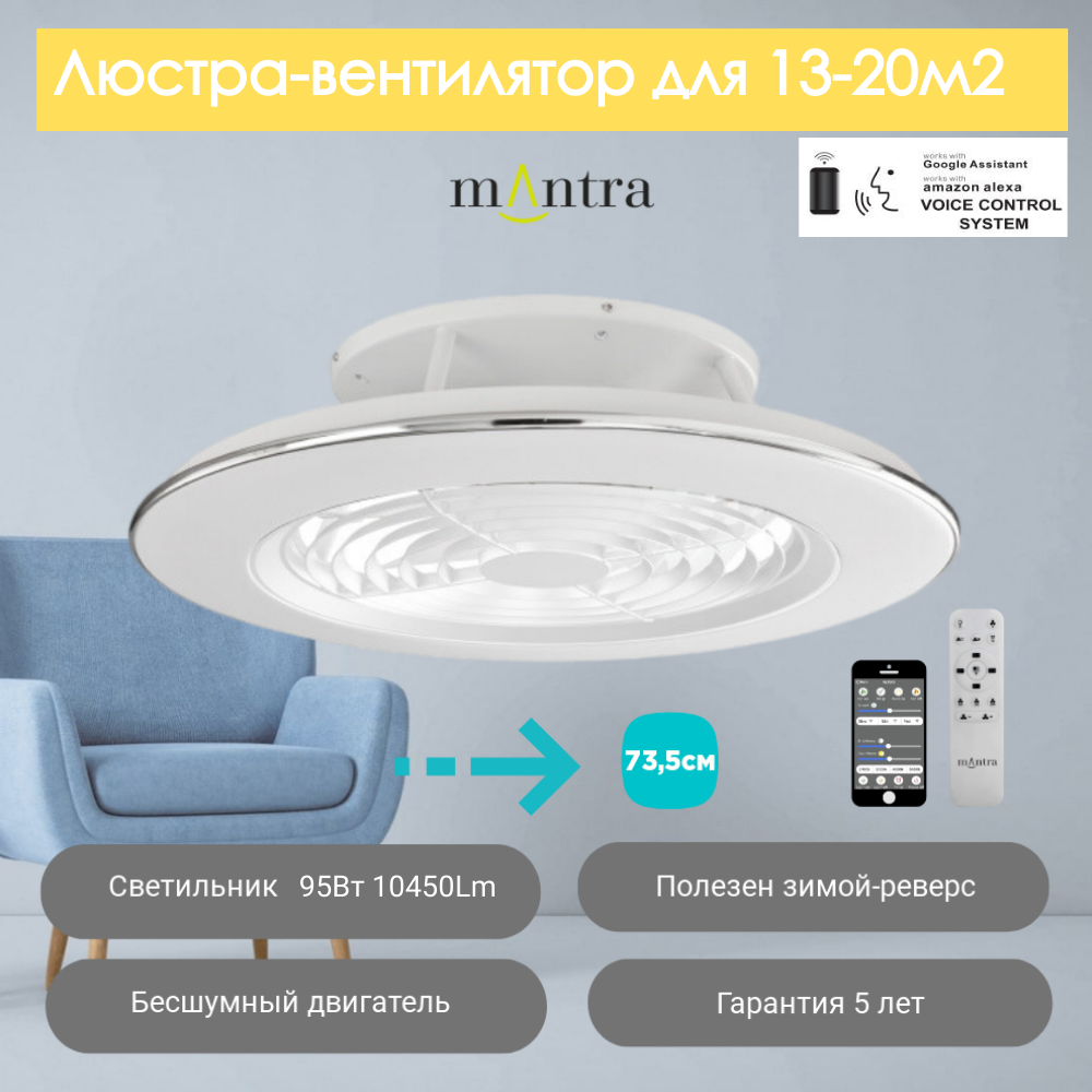 Создайте комфортный микроклимат в вашем доме с помощью стильной испанской люстры-вентилятора потолочной от Mantra! Эта элегантная модель для освещения и вентиляции, в в стиле модерн, станет украшением вашей гостиной, кухни, спальни или закрытой веранды. Благодаря 4 скоростям вращения и функции реверс вентилятор обеспечивает приятное охлаждение летом и рекупацию теплого воздуха зимой на площади до 13-20 м2. Оснащен двигателем DC-бесшумный. Лопасти, цвет - прозрачный, материал лопастей - пластик, цвет арматуры - белый. Люстра оснащена встроенным светодиодным светильником, мощностью 95 Вт, 2700-5000К, создавая уютную атмосферу. Управление вентилятором и освещением осуществляется с помощью удобного пульта управления, также при помощи скачанного приложения по Bluetooth. Данная модель имеет дополнительные функции — смена цветовой температуры, диммирование, таймер, ночной режим. Гарантия 5 лет. .создайте идеальный комфорт в вашем доме с помощью потолочного вентилятора со светильником!