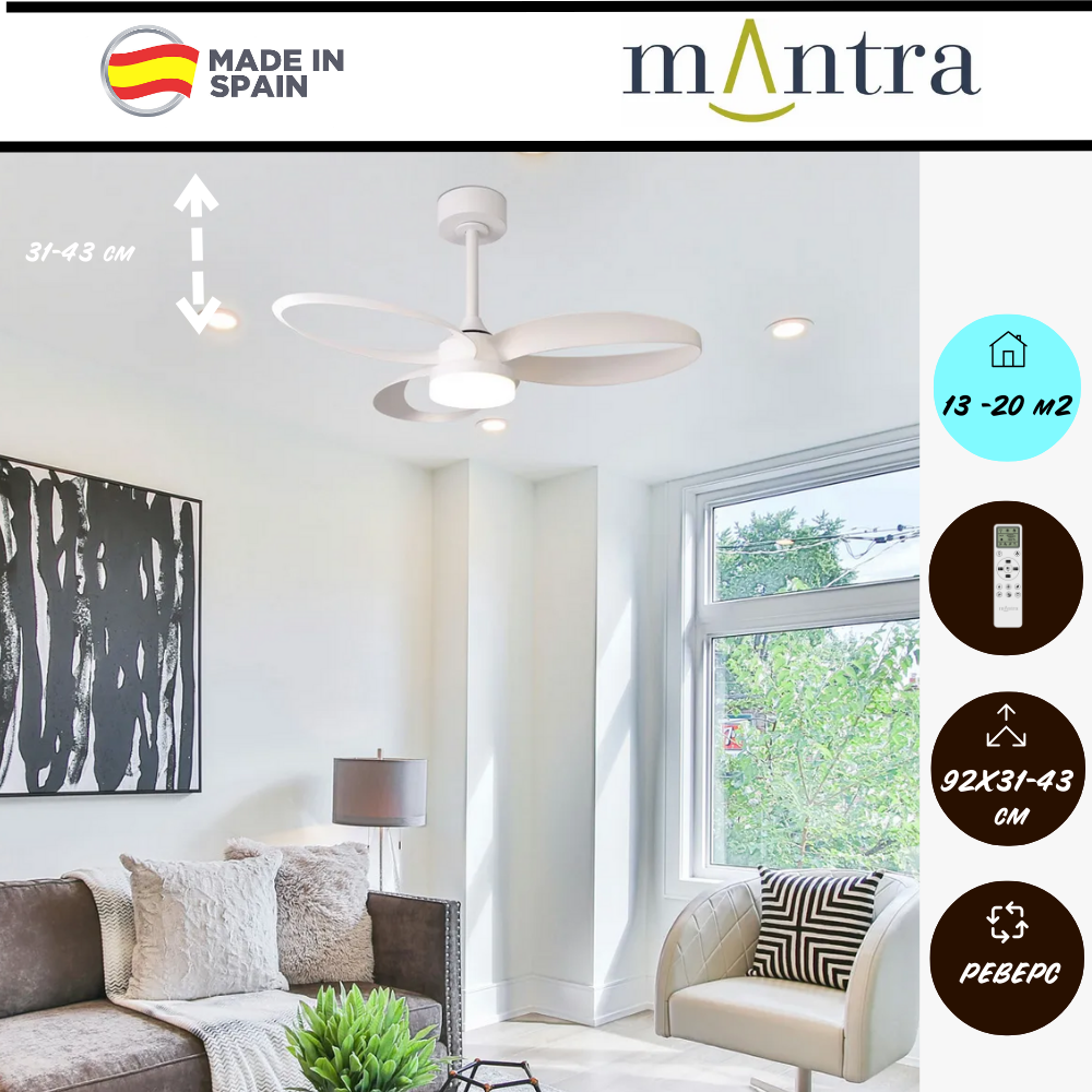 Создайте комфортный микроклимат в вашем доме с помощью стильной испанской люстры-вентилятора потолочной от Mantra! Эта элегантная модель для освещения и вентиляции, в в стиле модерн, станет украшением вашей спальни, гостиной, закрытой веранды, подходит для больших помещений. Благодаря 8 скоростям вращения и функции реверса, вентилятор обеспечивает приятное охлаждение летом и циркуляцию воздуха зимой на площади до 13-20 м2. Оснащен двигателем DC-бесшумный. Лопасти необоротные, цвет - белый, материал лопастей - пластик, цвет арматуры - белый. Люстра светодиодным светильником отраженного света на 24Вт с регулируемой цветовой температурой, создавая уютную атмосферу. Управление вентилятором и освещением осуществляется с помощью удобного пульта управления. Гарантия 5 лет. Дополнительные опции - диммирование, ночной режим, смена цветовой температуры, таймер, 2 штанги разной высоты для монтажа на комфортной высоте. Создайте идеальный комфорт в вашем доме с помощью потолочного вентилятора со светильником!