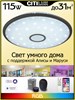 Светодиодная потолочная люстра Citilux Старлайт Смарт CL703A105G с голосовым управлением является ярким представителем современных УМНЫХ хай-тек светильников экосистемы Citilux Smart . Выпускается с белым глянцевым плафоном с эффектом звездного неба и декоративными элементами цвета венге. Светильник накладной, круглой формы, крепление подходит для всех типов потолков, в том числе натяжных. Моделью можно управлять: из приложения на смартфоне по Wi-Fi при наличии интернета, с помощью голосовых помощников Алиса и Маруся, есть возможность запуска настроенных сценариев с помощью Сири, а также пультом дистанционного управления и с настенного выключателя. Модель оснащена мощными светодиодами холодного и теплого света, независимой цветной подсветкой RGB. Мощность светильника 115Вт, с диммером и функцией плавной регулировки. Рекомендуется для площади до 31 м2.