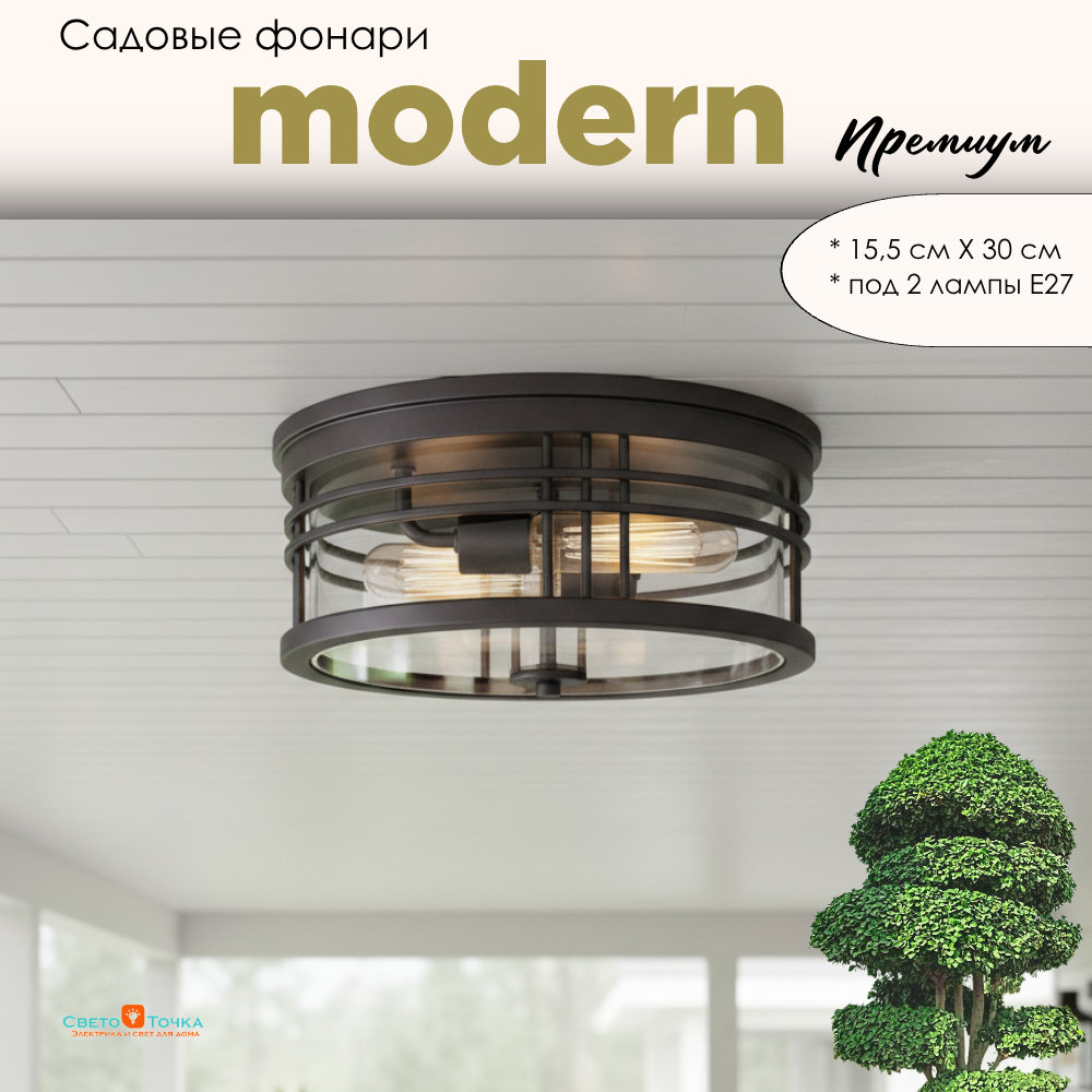 Уличный потолочный светильник фонарь на веранду 30*15,5см 2xЕ27 круглый черный IP44