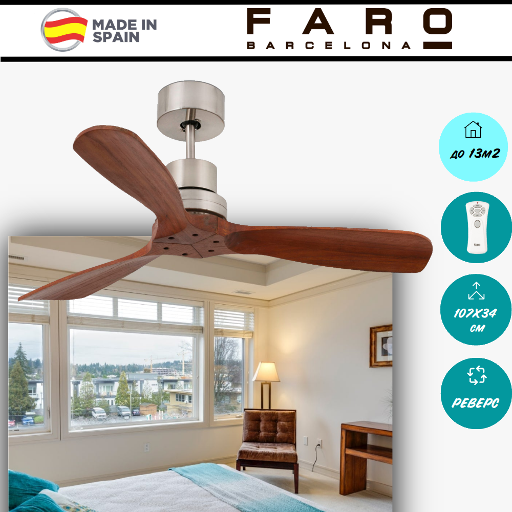 Потолочный вентилятор Faro Barcelona 107X34 СМ IP20 13 м2 с пультом ДУ 6 скоростей двигатель DC-бесшумный никель/коричневый