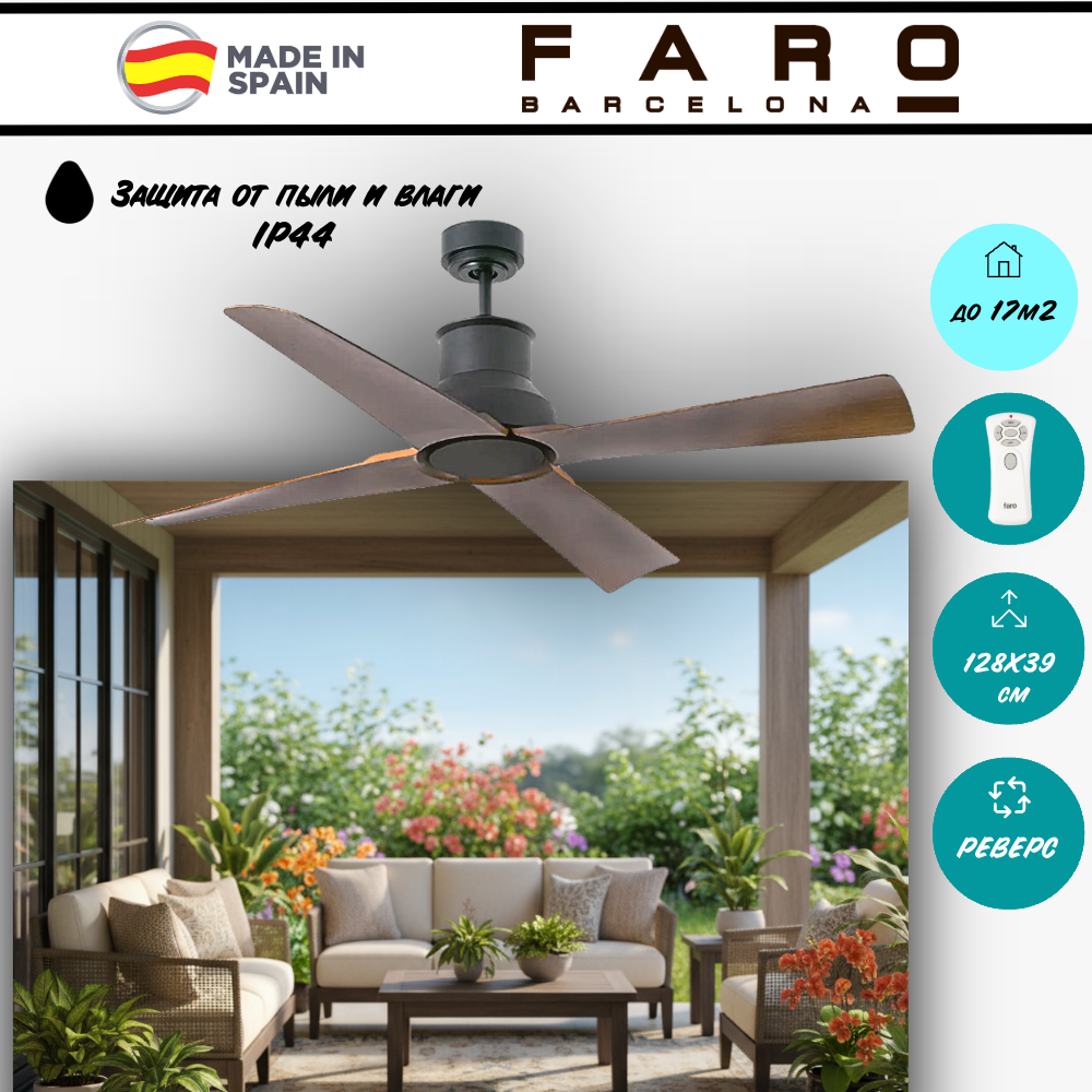 Создайте комфортный микроклимат в вашем доме с помощью стильного испанского потолочного вентилятора от Faro Barcelona! Эта элегантная модель для вентиляции, в классическом стиле, станет украшением вашей гостиной, спальни, кухни, закрытой или открытой веранды (высокая пылезлагозащита). Благодаря 6 скоростям вращения и функции реверса, вентилятор обеспечивает приятное охлаждение летом и циркуляцию воздуха зимой на площади до 13-17 м2. Оснащен двигателем DC-бесшумный. Оборотные лопасти позволят вам менять внешний вид вентилятора по своему настроению, цвет - коричневый, материал лопастей - ABS пластик, цвет арматуры - черный. Управление вентилятором осуществляется с помощью удобного пульта управления. . Гарантия 2 года. Дополнительные опции: светильник арт. 33484;удлиняющая штанга 30см арт.33962, 50см арт.33964 (продается отдельно).Поворотная арматура позволяет установить вентилятор на наклонную крышу.создайте идеальный комфорт в вашем доме с помощью потолочного вентилятора!
