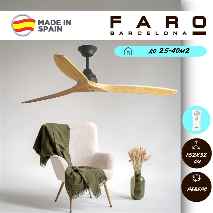 Потолочный вентилятор Faro Barcelona 152X32см IP20 25-40 м2 с пультом ДУ 6 скоростей двигатель DC-бесшумный дерево черный/клен