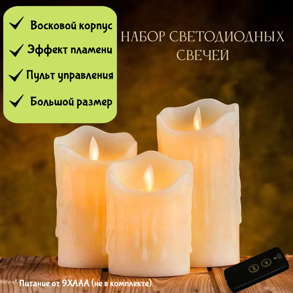 Светодиодный светильник, выполненный в виде трех свечей длиной 10, 12 и 15см. Управляется пультом дистанционного управления на расстоянии до 6м. В качестве источника питания используются три батарейки ААА 1.5V в каждую свечу. Светодиодные свечи изготовлены из полиуретана матового цвета с имитацией в верхней части подтеков воска. В рабочем состоянии светильник создает реальную иллюзию мерцающего пламени горящих свечей. Свечи можно установить все вместе в подсвечник или каждую отдельно в нужной точке. Светильник в виде трех свечей с электрическими светодиодными лампами – оригинальное решение для создания романтической обстановке в жилых помещениях, кафе, ресторанах. Это интересный подарок для друзей и близких людей.