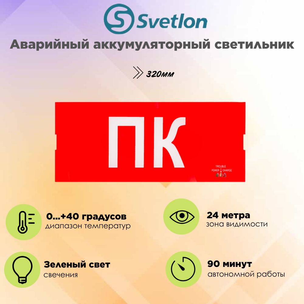 Светильник имеет встроенный аккумулятор, который позволяет продолжить работу устройства при выключении напряжения в сети в течение 90 минут, и может использоваться как аварийный светильник/указатель. Для полной подзарядки аккумулятора требуется 20 часов. Высокая яркость (≥60cd/m²) обеспечивает хорошую видимость светильника на расстоянии до 24 метров. Светильник может работать в диапазоне температур от 0 до 40 °С.