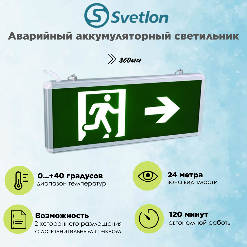 Светильник информационный аварийный, световой указатель "Выход направо стрелка бегущий" 360X150X22мм аккумуляторный с 1 стеклом 120 мин