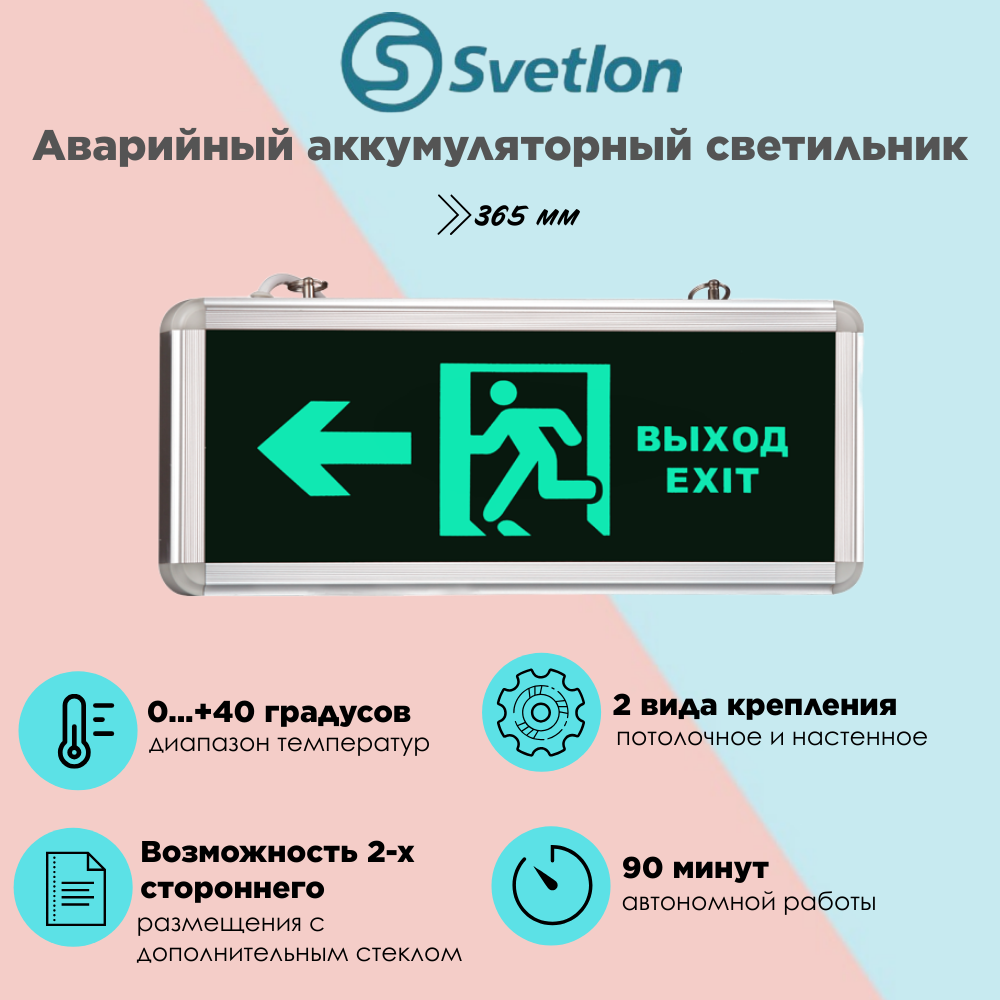 Весь корпус светильника/указателя выполнен из качественного алюминия и стекла (без наклеек). Внутри расположены светодиоды зеленого цвета, которые обеспечивают равномерное свечение по всему периметру. Конструкция светильника дает возможность при приобретении и установке дополнительного (второго) стекла, сделать данный световой указатель двусторонним. Светильник имеет 2 вида крепления: потолочное и настенное.