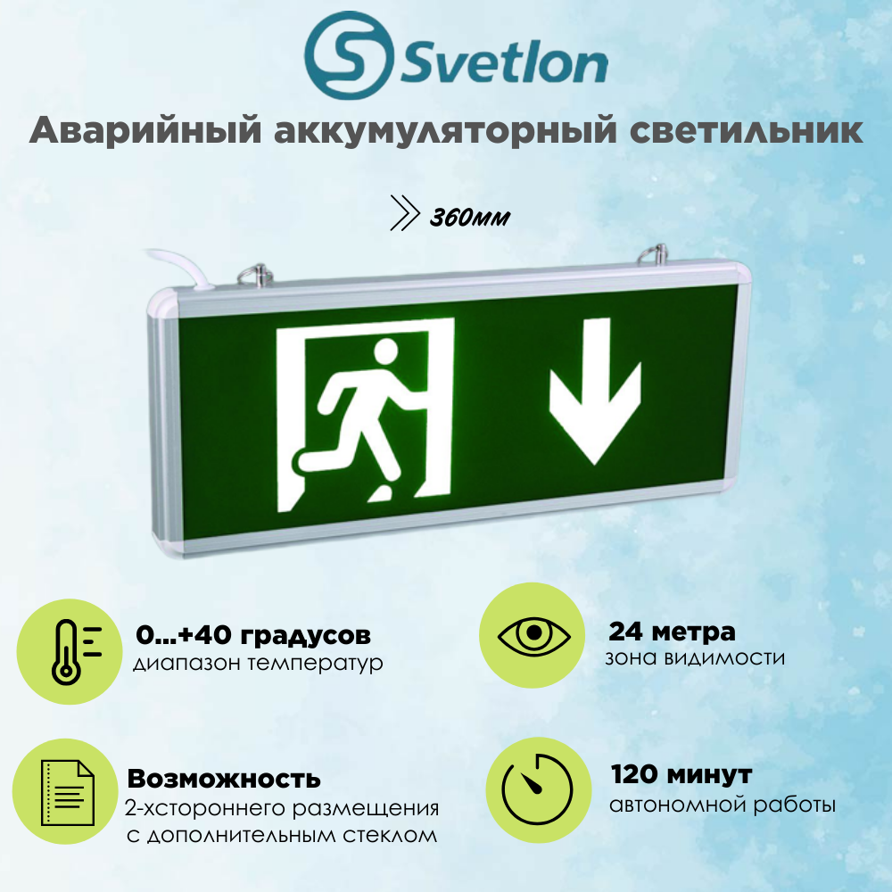 Светильник информационный аварийный, световой указатель "Выход вниз стрелка бегущий" 360X150X22мм аккумуляторный с 1 стеклом 120 мин