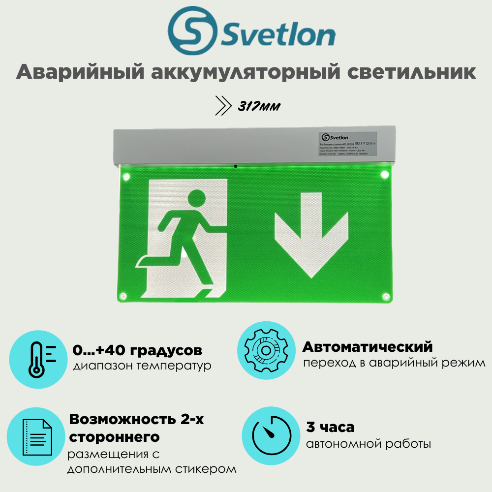 Светильник информационный аварийный "Выход/стрелка/вниз" белый свет 317X203мм аккумуляторный с 1 стикером