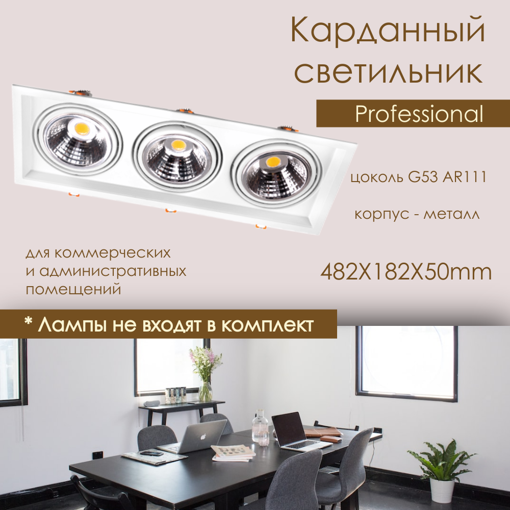 Светильник карданный встраиваемый прямоугольный на 3 лампы G53 AR111 482X182мм белый поворотный
