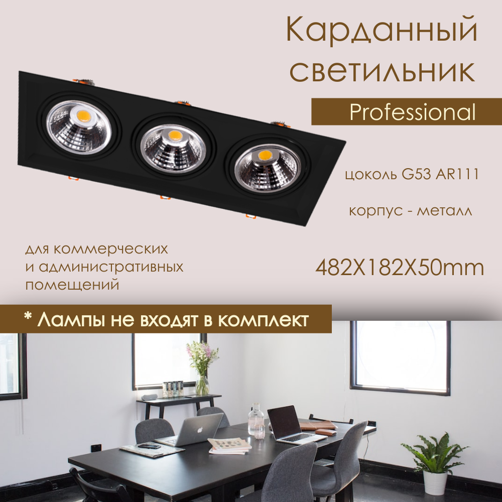 Светильник карданный встраиваемый прямоугольный на 3 лампы G53 AR111 482X182мм черный поворотный