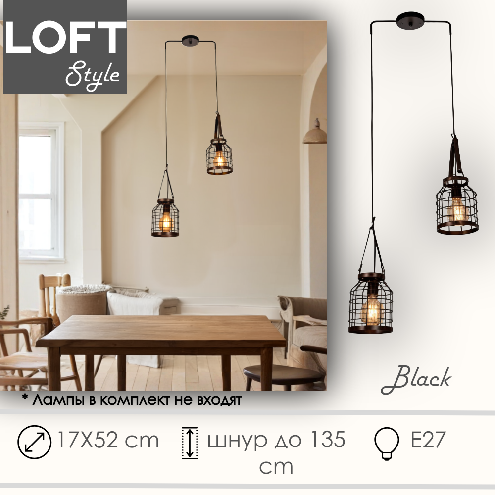 Светильник подвесной лофт черный-коричневый 17X52см, с 2 круглыми плафонами решетками Е27 (17X22см) шнур до 1,35м, металл, кожа