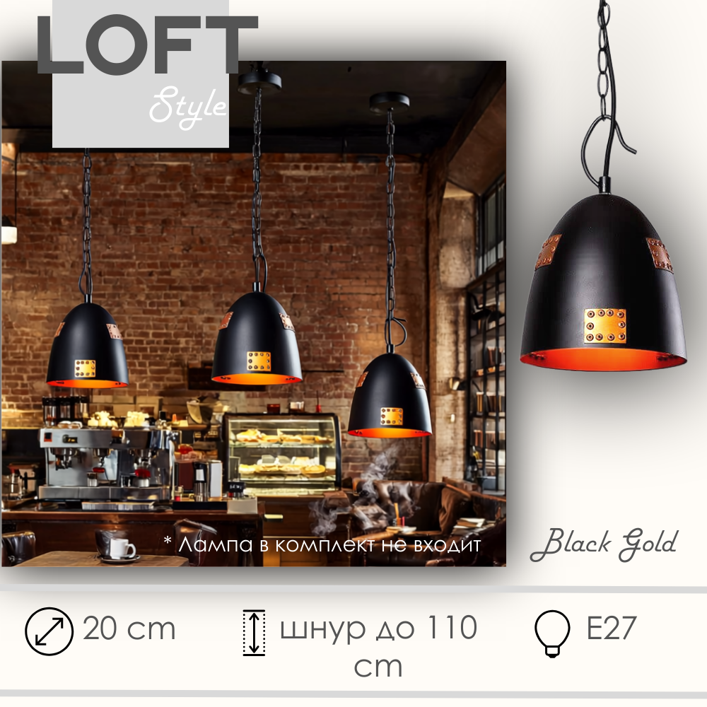 Светильник подвесной в стиле лофт, черный-золото, 20×30,5 см, шнур до 1,1 м