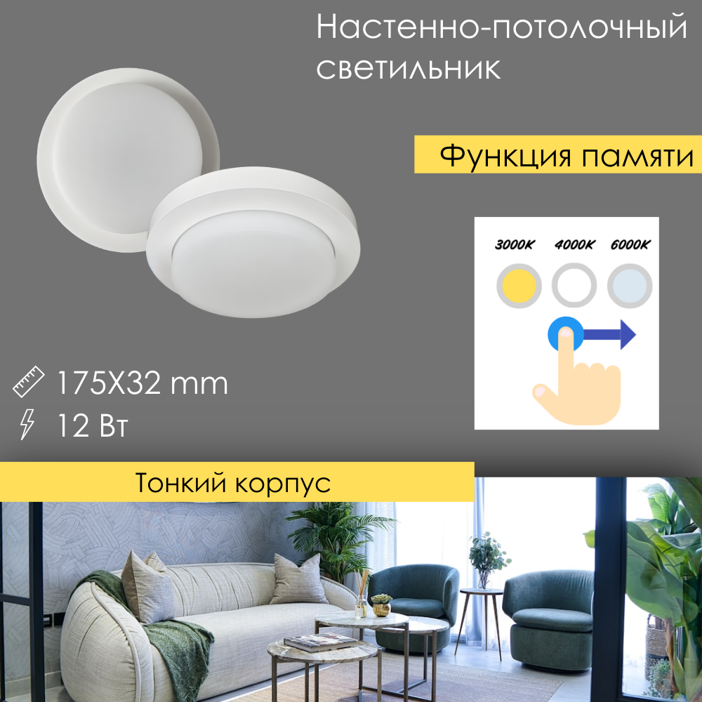 Светильник светодиодный настенно-потолочный круглый 12Вт, 3000/4000/6000К, 175×32мм, белый