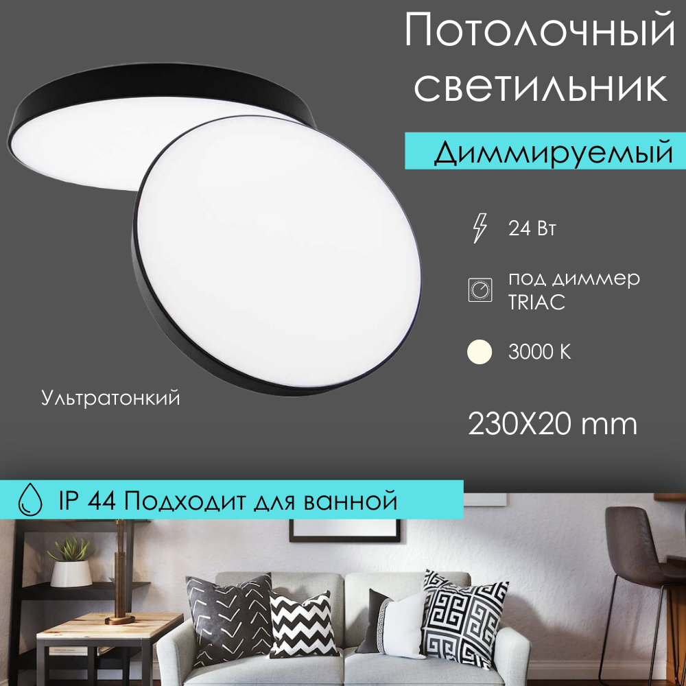 Светильник светодиодный потолочный круглый 23X2см влагостойкий IP44 диммируемый черный-белый тонкий 3000К