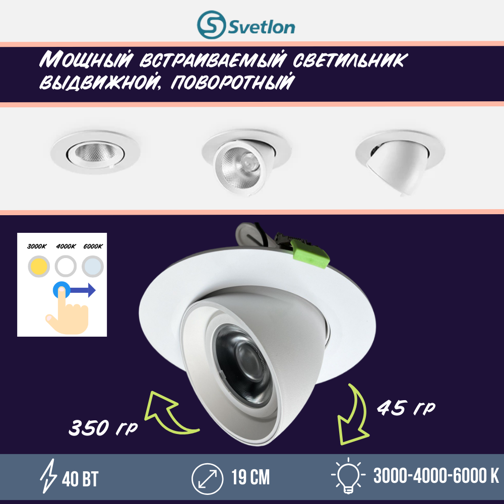 Светильник светодиодный встраиваемый поворотно-выдвижной Downlight 19см 40Вт 3000-4000-5000К белый круглый