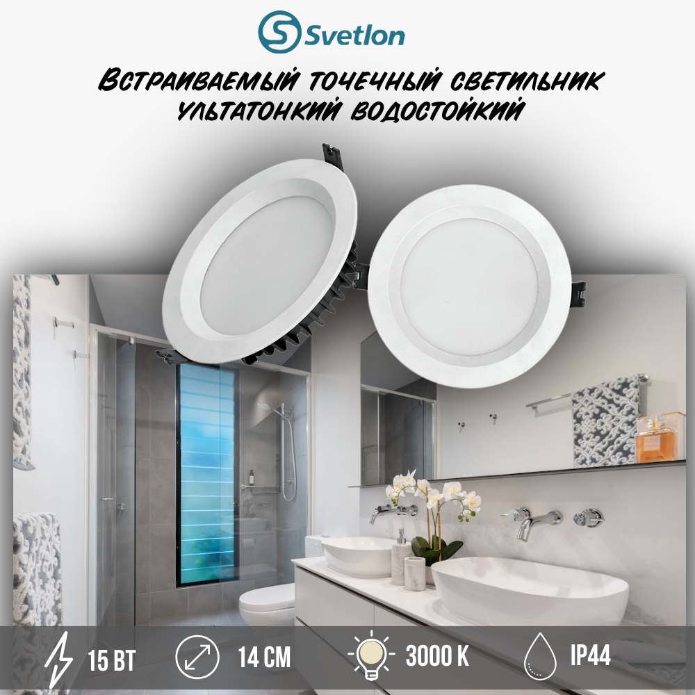 Светильник светодиодный встраиваемый точечный влагостойкий 15Вт 3000К ультратонкий D14см круг IP44