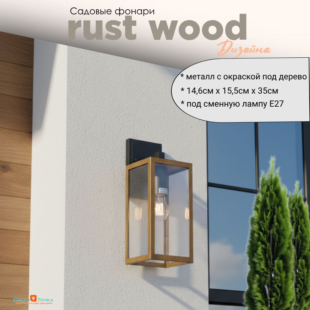 Уличный фонарь настенный в оригинальном цвете rust wood — сочетание черного металла с изысканной окраской под дерево. Такая отделка придаёт теплоту и природный акцент фасаду, веранде или летней площадке. Корпус выполнен из литого алюминиевого сплава, плафон — из прочного стекла. Светильник устойчив к влаге и перепадам температур, подходит для эксплуатации в российских климатических условиях. Современный минималистичный дизайн делает его уместным у входа в дом, на террасе, балконе, в ресторане, кафе, гостинице или садово-парковой зоне. Характеристики: • Материал: алюминиевый сплав, стекло • Цвет: rust wood (черный с декором под дерево) • Размеры: 14,6*15,5*35 см • Мощность: до 60 Вт • Цоколь: E27 • Напряжение: AC 220–240V, 50/60Hz • Степень защиты: IP44 • Диапазон температур: –25°…+40° • Тип монтажа: настенный