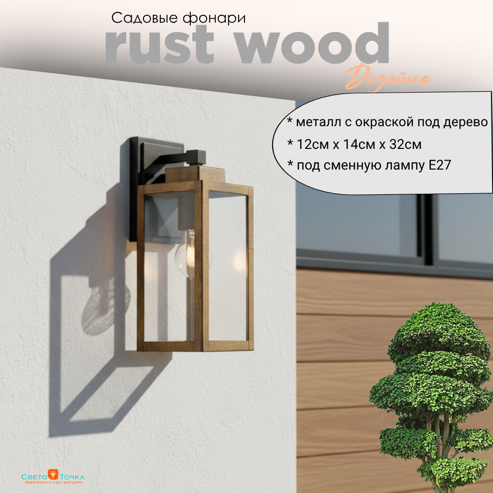 Уличный фонарь настенный в оригинальном цвете rust wood — сочетание черного металла с изысканной окраской под дерево. Такая отделка придаёт теплоту и природный акцент фасаду, веранде или летней площадке. Корпус выполнен из литого алюминиевого сплава, плафон — из прочного стекла. Светильник устойчив к влаге и перепадам температур, подходит для эксплуатации в российских климатических условиях. Современный минималистичный дизайн делает его уместным у входа в дом, на террасе, балконе, в ресторане, кафе, гостинице или садово-парковой зоне. Характеристики: • Материал: алюминиевый сплав, стекло • Цвет: rust wood (черный с декором под дерево) • Размеры: 12,7*14,7*32,1 см • Мощность: до 60 Вт • Цоколь: E27 • Напряжение: AC 220–240V, 50/60Hz • Степень защиты: IP44 • Диапазон температур: –25°…+40° • Тип монтажа: настенный