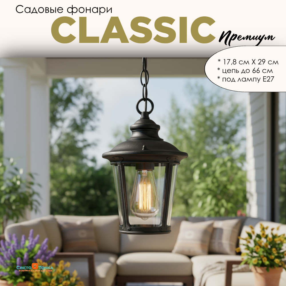 Подвесной фонарь уличный классический IP44, E27 – надежное и стильное решение для освещения садово-парковых зон, придомовых территорий, террас и летних площадок ресторанов или кафе. Его универсальный дизайн позволяет использовать модель как в уличных условиях, так и в интерьерах, где требуется выразительный акцент в классическом стиле. Корпус выполнен из алюминиевого сплава методом литья и покрыт прочной порошковой краской, которая защищает от коррозии и увеличивает срок службы. Плафон изготовлен из прозрачного стекла, равномерно распределяющего свет. Светильник рассчитан на лампу с цоколем E27. Класс защиты IP44 гарантирует надежную работу в условиях улицы, при дожде и перепадах температуры. Модели данной серии отличаются строгим классическим дизайном в черном цвете, который подчеркивает элегантность экстерьера и органично вписывается в любой архитектурный стиль. Характеристики: Материал: алюминиевый сплав, стекло Цвет: черный Размеры: 178*290 мм цепь 66 см Цоколь: E27 Напряжение: AC 220–240V, 50/60Hz Степень защиты: IP44 Тип монтажа: настенный Данные светильники придадут садовой зоне уют, подчеркнут атмосферу загородного дома и создадут гармоничный световой акцент в вечернее время.