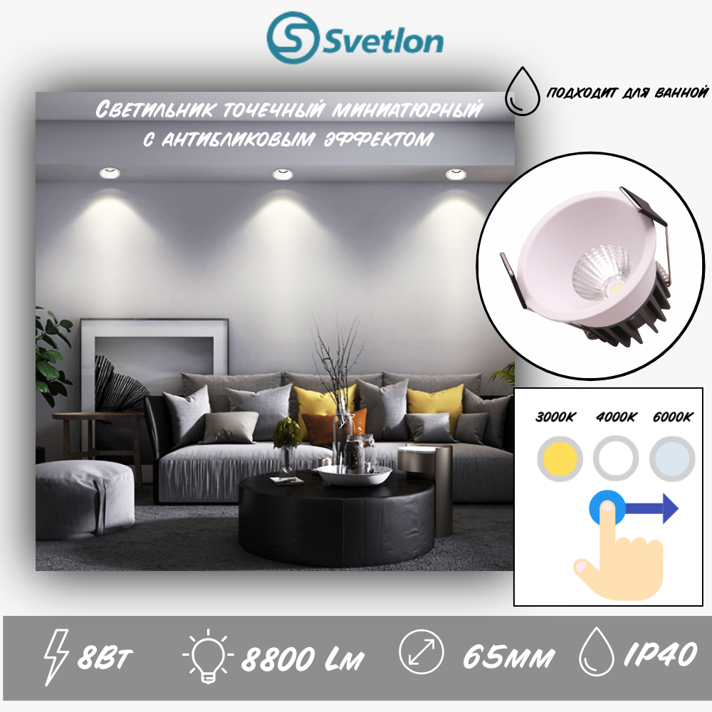 Светильник встраиваемый точечный круглый миниатюрный 6,5см белый 8Вт IP40 влагостойкий 3000-4000-5000К 3CCT