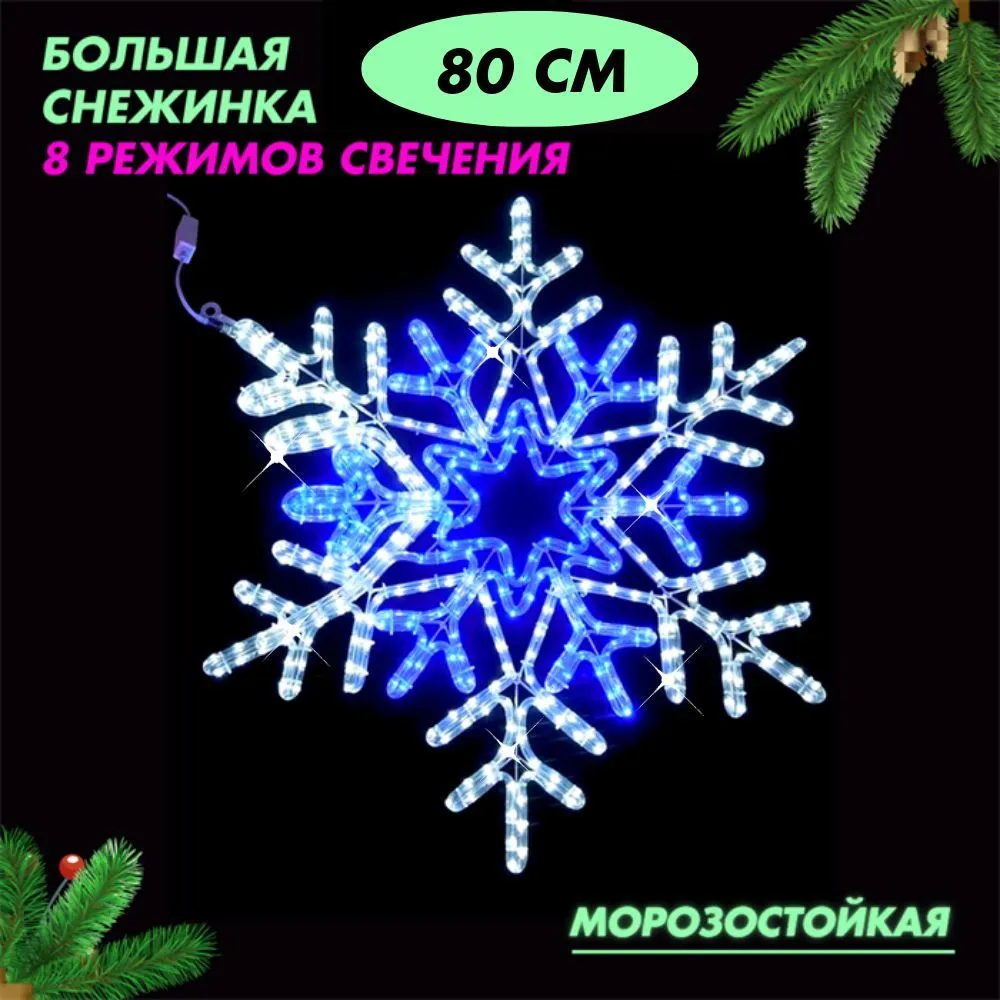 Световая фигура уличная новогодняя светодиодная Снежинка большая, 8 режимов белое-синие свечение, D80см IP54, украшение на Новый год