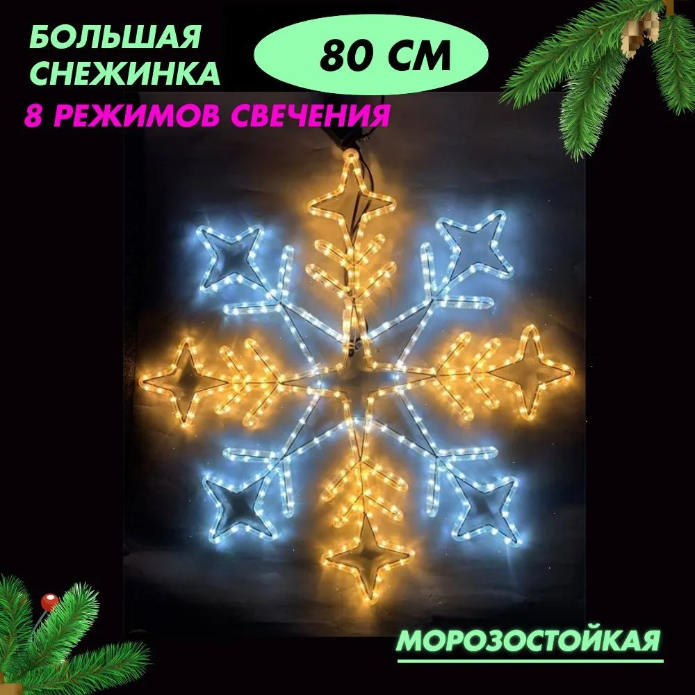 Световая фигура уличная новогодняя светодиодная Снежинка большая, 8 режимов, контролер, белое+теплое свечение, D80см IP54, украшение на Новый год