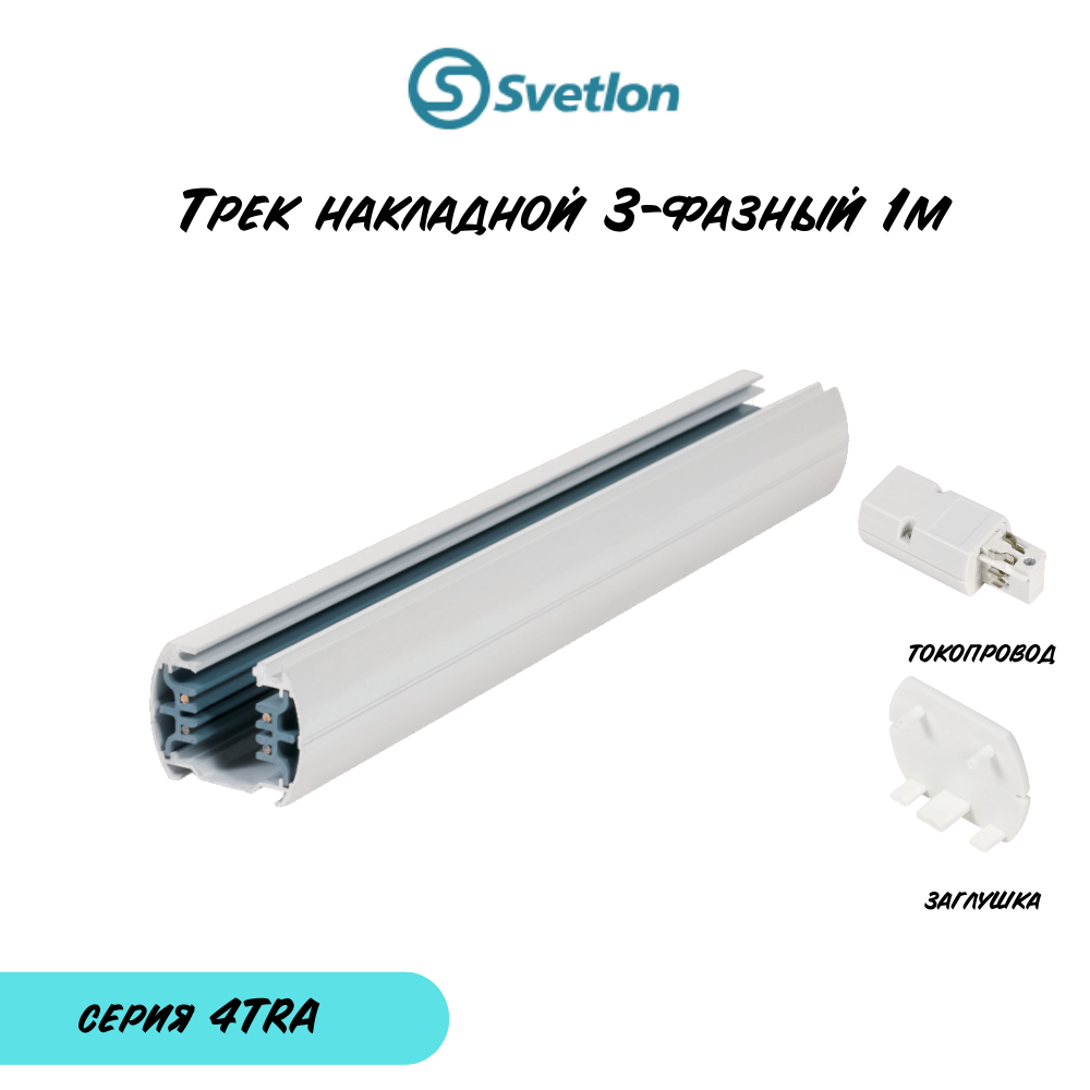 Трек трехфазный шинопровод белый 1м 4TRA накладной полукруглый с заглушкой и токопроводом