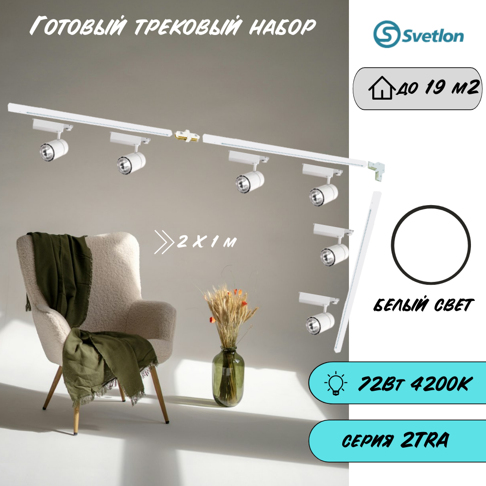 Готовый набор из треков на 3м и 6-х трековых светильников, освещение до 19м2 общей мощностью на 72Вт. Каждый светодиодный светильник LED 12W это надёжный и компактный светильник заливающего света, предназначенный для декоративного или акцентного освещения торговых помещений, зданий и сооружений хозяйственного и жилого предназначения. В качестве источника света в составе светильника используется светодиодный модуль мощностью 12W, срок службы которого может достигать 40000 часов. Продолжительный период эксплуатации светодиодного модуля обеспечивается использованием в конструкции светильника качественного блока питания и эффективной системы охлаждения. Отражатель светильника обеспечивает равномерное распределение света по всей поверхности светового пятна. Цвет - белый, цвет свечения - белый.