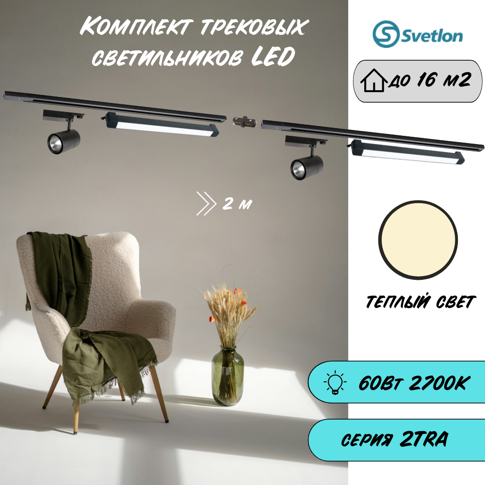 Готовый набор из треков на 2м и 6-х трековых светильников, освещение до 16м2 общей мощностью на 72Вт. Каждый светодиодный светильник LED 12W это надёжный и компактный светильник заливающего света, предназначенный для декоративного или акцентного освещения торговых помещений, зданий и сооружений хозяйственного и жилого предназначения. В качестве источника света в составе светильника используется светодиодный модуль мощностью 12W, срок службы которого может достигать 40000 часов. Продолжительный период эксплуатации светодиодного модуля обеспечивается использованием в конструкции светильника качественного блока питания и эффективной системы охлаждения. Отражатель светильника обеспечивает равномерное распределение света по всей поверхности светового пятна.