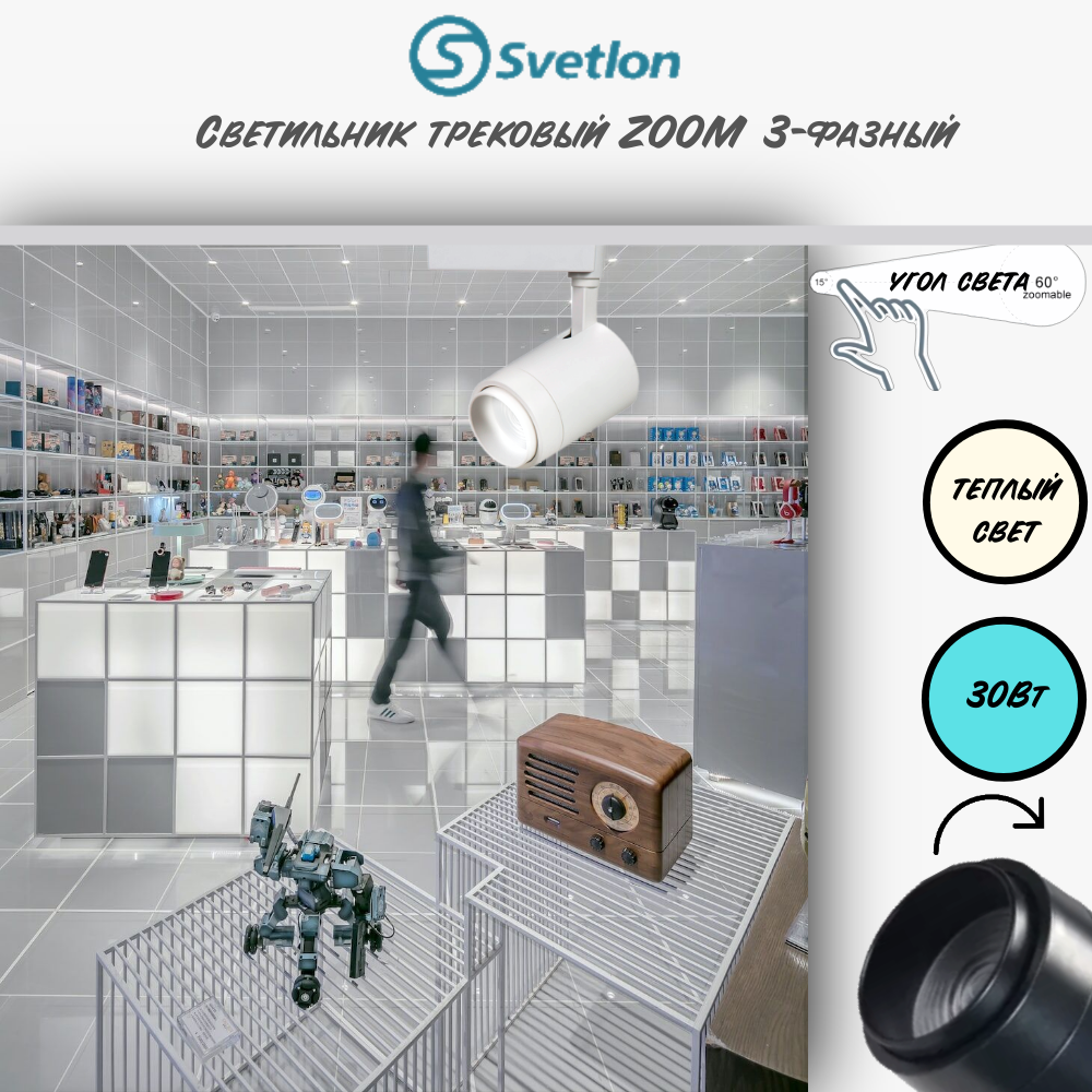 Трековый светильник светодиодный 3-фазный белый 30Вт 3000К 4TRA ZOOM 15-60гр регулируемый угол свечения