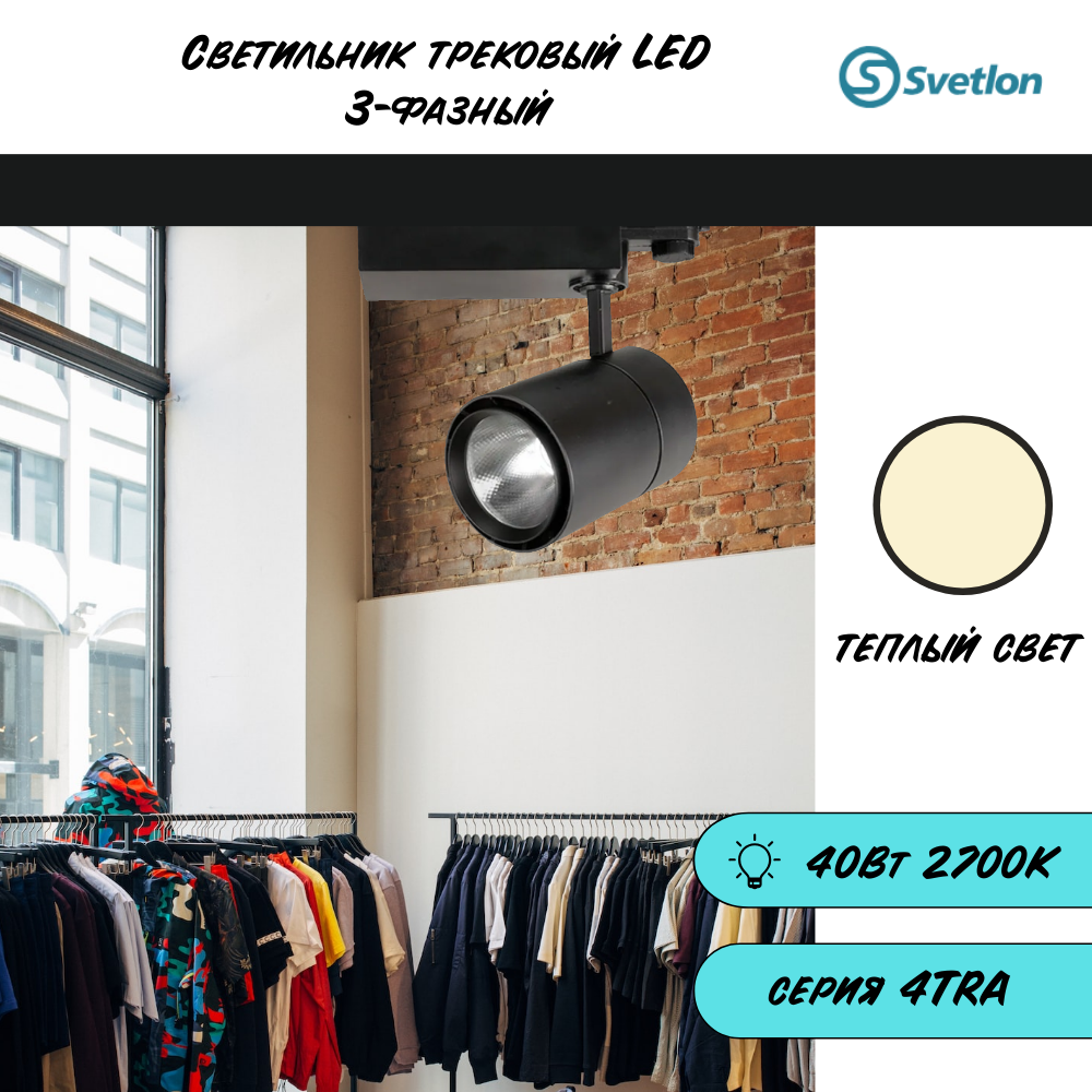 Светодиодные светильники LED 40W - трековые светильники заливающего света, предназначенные для основного или акцентного освещения торговых помещений, коммерческих зданий и сооружений, прочих мест, где необходимо более яркое и интенсивное освещение. В качестве источника света используется светодиодный модуль мощностью 40W. Продолжительный период эксплуатации светодиодного модуля обеспечивается использованием в конструкции светильника качественного блока питания и эффективной системы охлаждения. Отражатель светильника обеспечивает равномерное распределение света по всей поверхности светового пятна. Изделие выпускается в комплекте с адаптером, предназначенным для подключения светильника к трекам 4TRA. Цвет арматуры - черный, цвет свечения - теплый белый.