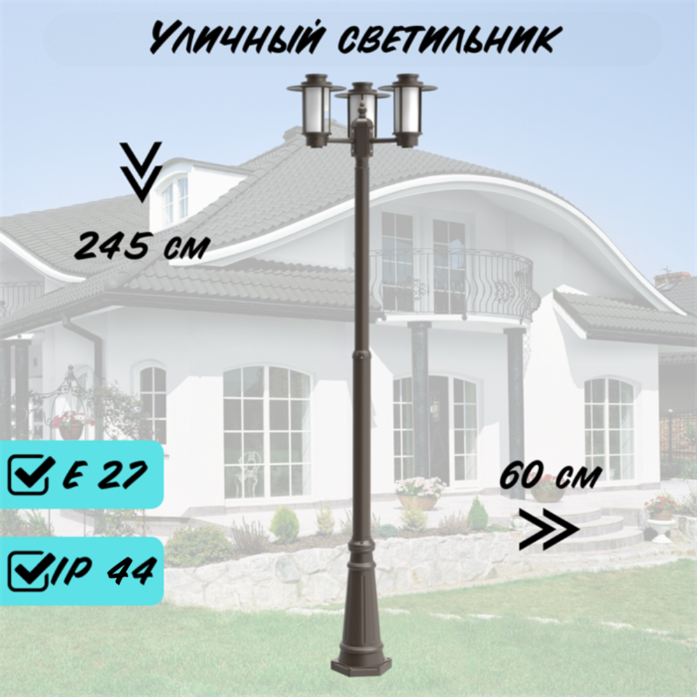Светильник имеет 3 головы и идеально подходит для размещения на открытых участках территории с целью освещения зон отдыха, придомовой территории, парковых дорожек, аллей и т.д.